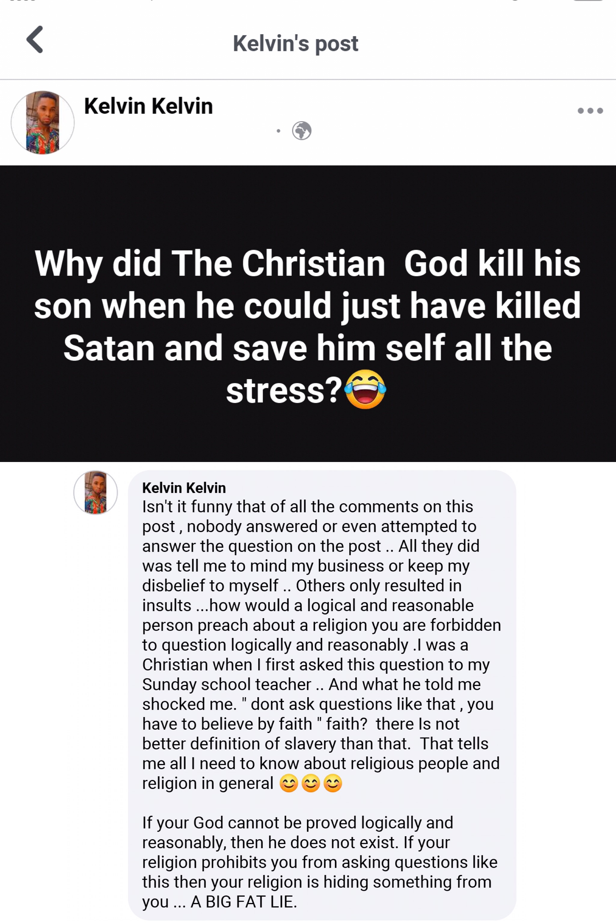 “Why did the Christian God kill his son when he could just have killed Satan and save him all the stress?”